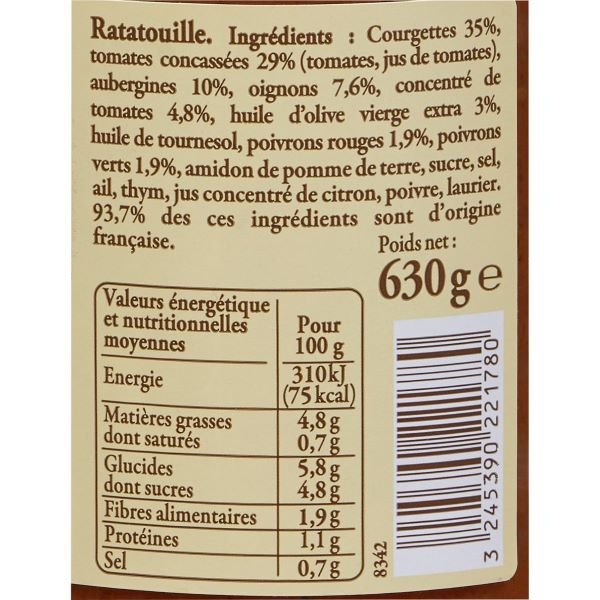 Sudėtis: Cukinijos 35%, smulkinti pomidorai 29% (pomidorai, pomidorų sultys), baklažanai 10%, svogūnai 7,6%, pomidorų pasta 4,8%, aukščiausios kokybės pirmojo spaudimo alyvuogių aliejus 3%, saulėgrąžų aliejus, raudonos paprikos 1, 9%, žaliosios paprikos 1,9%, bulvių krakmolas, cukrus, druska, česnakai, čiobreliai, koncentruotos citrinos sultys, pipirai, lauro lapas.