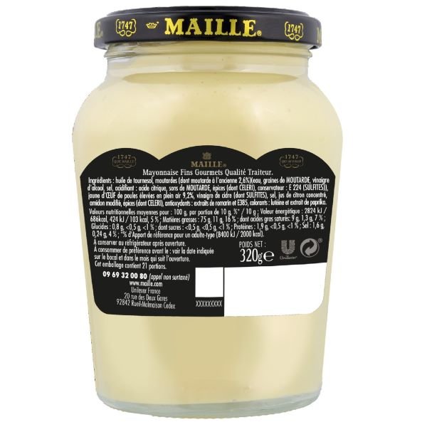 Sudėtis: rapsų aliejus, 9,3% laisvai auginamų vištų kiaušinio trynys, Dižono garstyčios, sidro actas, senovinės (su grūdeliais) garstyčios 2, 7%, druska, koncentruotos citrinos sultys, prieskoniai (įskaitant salierus), antioksidantas: rozmarinų ekstraktai, dažikliai: karotinoidai.