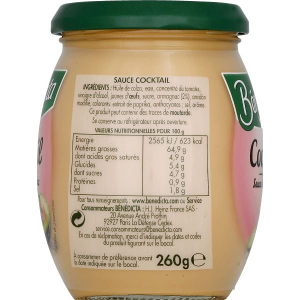 Sudėtis: Rapsų aliejus, vanduo, pomidorų pasta, alkoholio actas, kiaušinio tryniai, cukrus, armanjakas (2%), modifikuotas krakmolas, dažikliai: paprikos ekstraktai, antocianinai; druska, aromatas. Šiame produkte gali būti garstyčių pėdsakų.