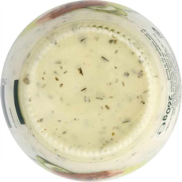 Sudėtis: Rapsų aliejus, vanduo, alkoholio actas, kiaušinio trynys, druska, cukrus, peletrūnas (1,5%), askaloniniai česnakai (1,5%), krapai, citrinų sultys iš koncentrato, aitriosios paprikos, natūralios kvapiosios medžiagos, modifikuotas krakmolas, spalva: beta-karotinas. Šiame produkte gali būti garstyčių pėdsakų.