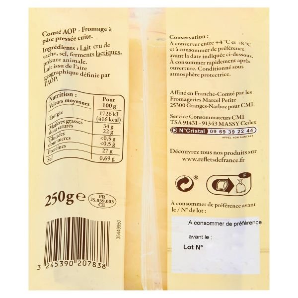 Presuotas kaitinto pieno sūris „Comté AOP“. Pienas iš AO (kilmės apeliacija) apibrėžtos geografinės vietovės.